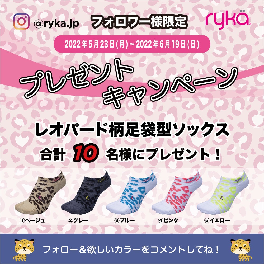 ゼット株式会社(本社/⼤阪市天王寺区、代表取締役社⻑/渡辺裕之)が取り扱う『ryka(ライカ)』ブランドの公式インスタグラムアカウント(https://www.instagram.com/ryka.jp/)にて、2022年5⽉23⽇(⽉)〜6⽉19⽇(⽇)の期間中、レオパード柄足袋型ソックスが抽選で当たるキャンペーンを開催中です。