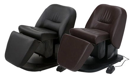 フットペダルによる電動リクライニング機能が付いた、フットレストと背もたれが連動して動くコンパクトなフルフラット電動シャンプーイス