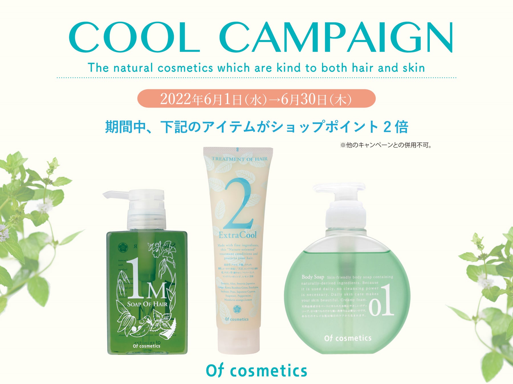 サロンクオリティのナチュラルコスメを展開する、株式会社オブ・コスメティックス(東京都中央区銀座:代表古里オサム)は、6月1日(水)~6月30日(木)まで、対象店舗にて「ソープオブヘア・1-M」「トリートメントオブヘア・2-EC」「ソープオブボディ・01-G」の3つのクール系アイテムいずれかをご購入のお客様に、ショップポイントが2倍になるクールキャンペーンを実施いたします。
