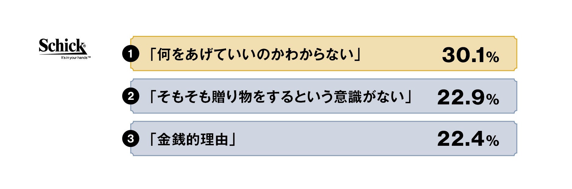 ウェットシェービング国内トップシェア(※1)を誇るシック・ジャパン株式会社(本社:東京都品川区、代表取締役社長:ニコラス パウエル、以下シック)は、6月19日の「父の日」を前に、「子どもからの贈り物」に関する調査を実施しました。本リリースでは、アンケート調査により判明した父の日に「子どもから贈り物をもらえない期間」についての情報や、その期間を「セルフ父の日」で楽しむための情報をお届けします。