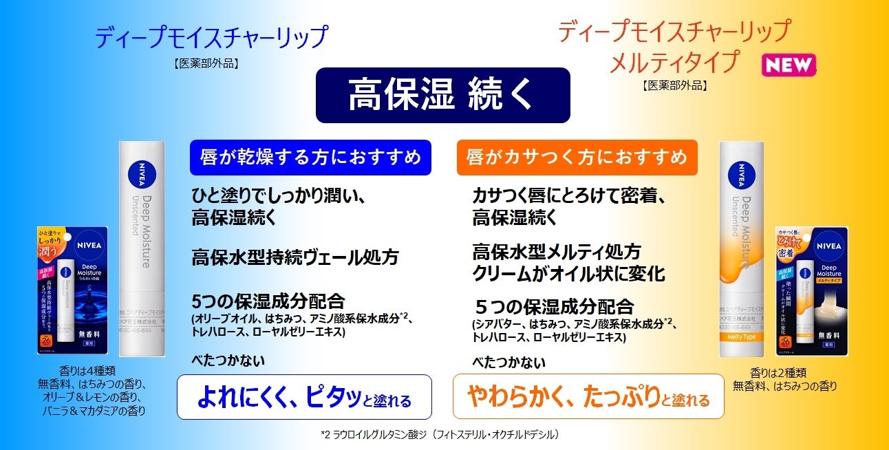 ニベア花王株式会社(社長・岩﨑昌哉)は、2022年7月30日、リップクリーム市場売上No.1(*1) 「ニベア ディープモイスチャーリップ」シリーズより、カサつく唇にもとろけて密着する『メルティタイプ』を新発売いたします。塗った瞬間、クリームがとろけてオイル状に変化し、乾燥してカサついた唇にも優しく密着するリップクリームです。