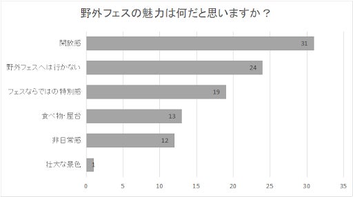 次に、「野外フェスの魅力」についてもアンケートを行いました。一番多かったのは「開放感」と答えた人で31人です。