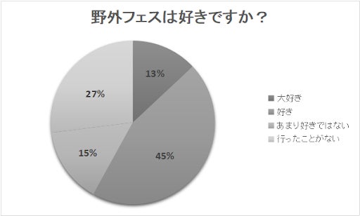 綺和美では、「野外フェスは好きですか?」というアンケートを行いました。結果は、「大好き」と答えた人が13%、「好き」と答えた人が45%で半数以上の人が好きということがわかりました。