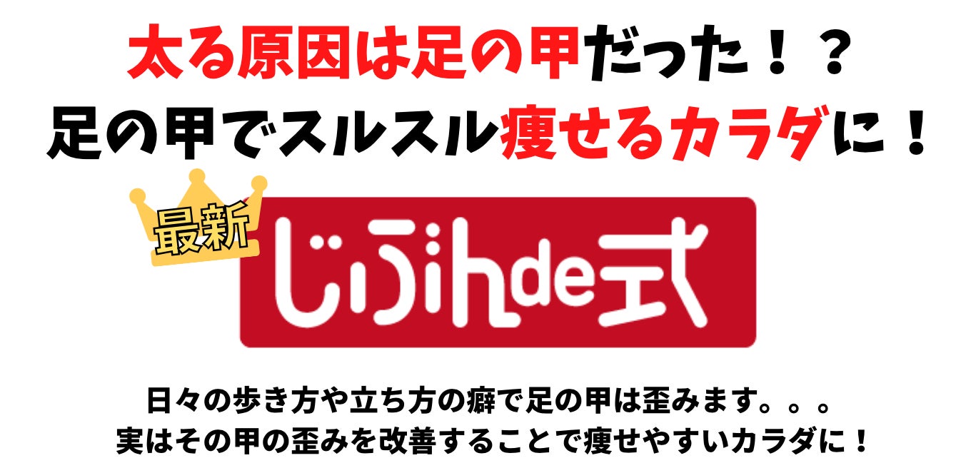 最新のダイエット法である”じぶんde式ダイエット”とは、足の甲をエステマシンでケアする甲剥がしを行っていただく方法です。太る原因が実は足の甲にあることはご存知でしょうか…?日々の歩き方や立ち方の癖で足の甲は歪みます。実はその歪みを改善することで痩せやすい身体へ!