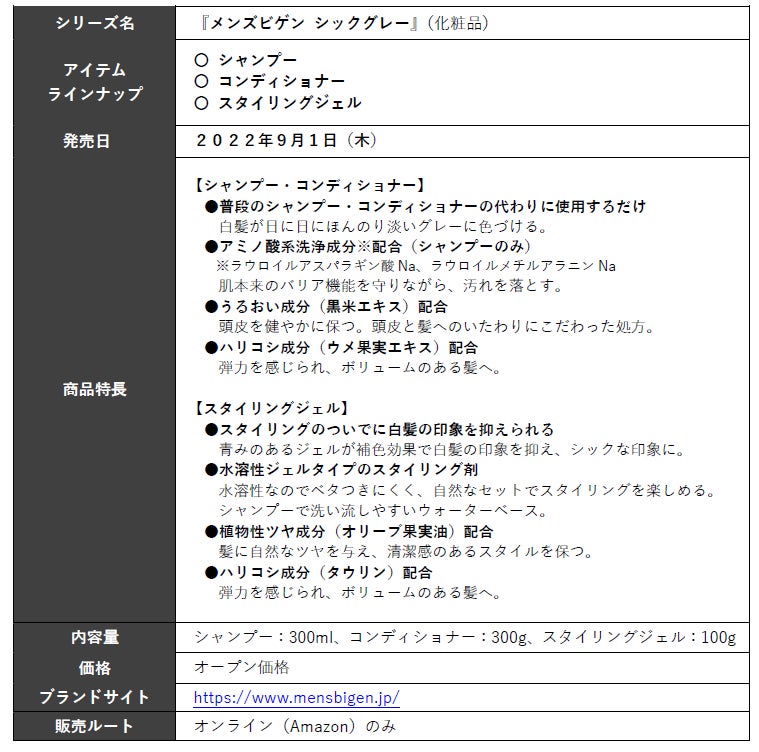 ホーユー株式会社(愛知県名古屋市)は、男性向け白髪ケア市場のリーディングブランドである「メンズビゲン」より、本来の髪色を活かして整え、髪にシックな印象をプラスする白髪ケアシリーズ『メンズビゲン シックグレー』シリーズを、2022年9月1日(木)よりAmazon限定にて発売いたします。