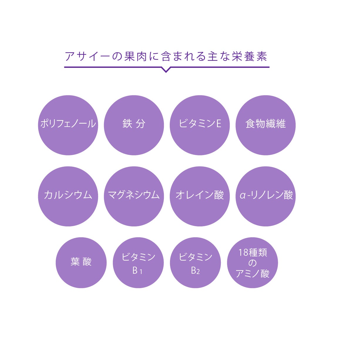 アサイーフリーズドライパウダーには生プルーンの58倍の鉄分が入っている他、カルシウムやビタミン、葉酸など人のカラダに大切な栄養素が10種類以上も含まれています。