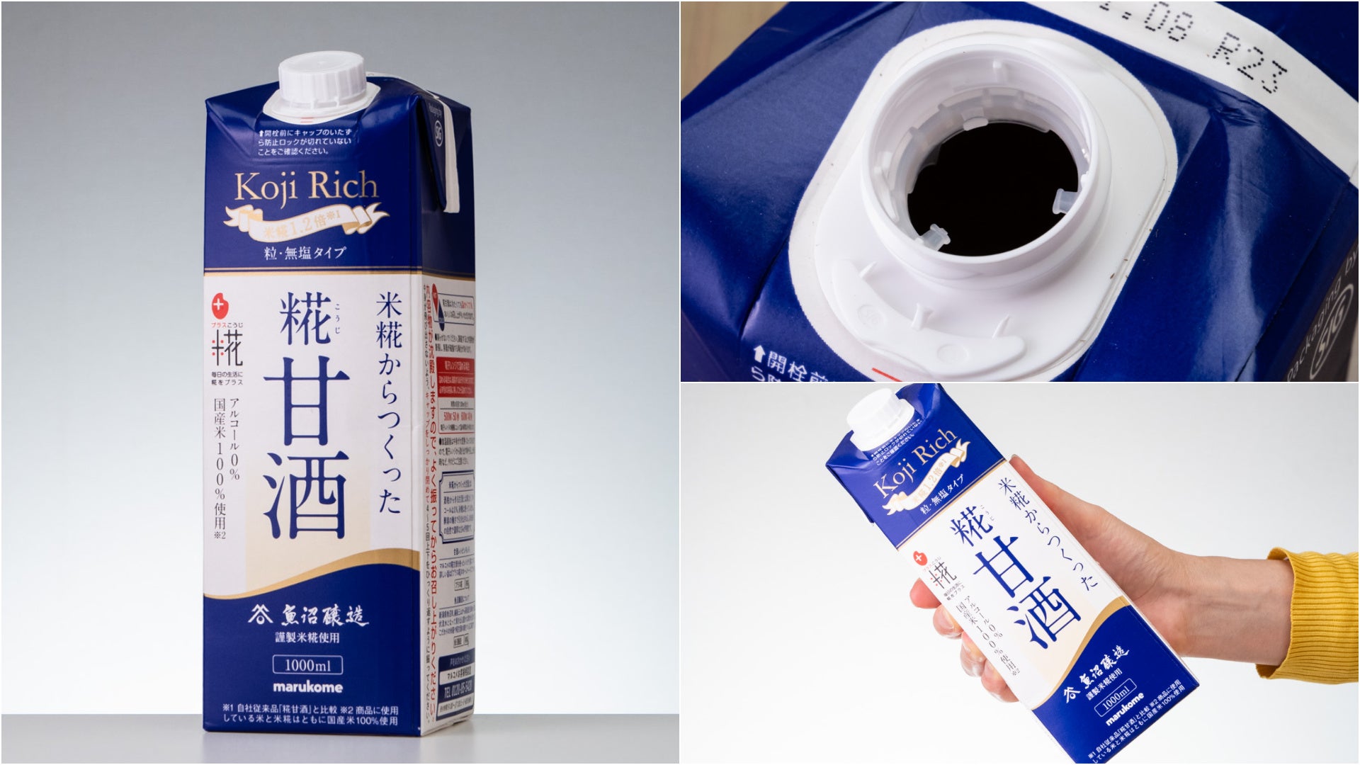 もうひとつは、食塩不使用で米糀を1.2倍にしたこと。従来の商品には甘さを際立たせるために食塩を加えていますが、これを入れないことで、角のない優しい甘さが口に広がるすっきりとした味わいに。ややパンチが欠ける分、米糀の割合を増やすことで自然なコクと甘さをプラスしました。そして、容器にもひと工夫。新容器に変えることで世界初、粒入り糀甘酒の無菌充填を可能とし、常温で長期保管できる形態を実現しました。
