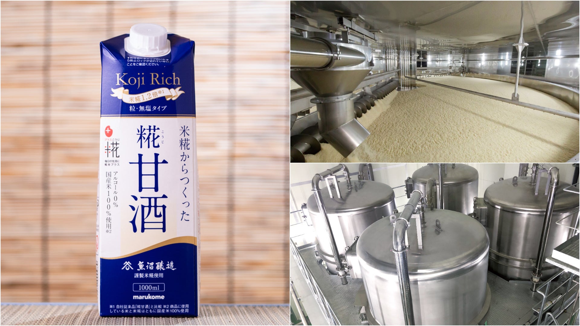 そんなマルコメの甘酒は、スタンダード商品「プラス糀 糀甘酒LL」を中心に、豆乳ブレンドや生姜、ゆず、抹茶と組み合わせたものなど、さまざまなラインナップを展開しています。そして今回、「プラス糀 糀甘酒LL 糀リッチ粒」を新発売。糀の粒を残し、糀本来の甘みを感じられる味わいに仕上げました。食塩を使っていないのでさらっと飲みやすく、米糀の量を通常の甘酒の1.2倍にすることで自然なコクと甘さを引き出しています。