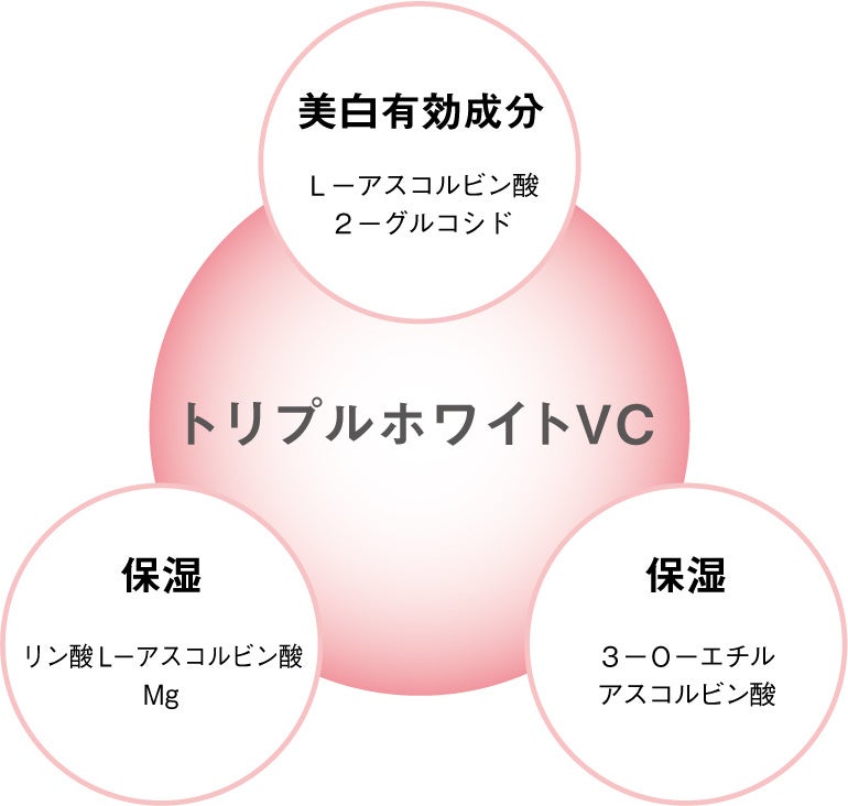 - 1. 3種のビタミンC誘導体を配合し、メラニン生成の原因にアプローチ