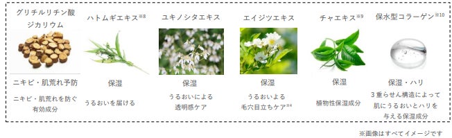 ニキビ・肌荒れ防止有効成分の「グリチルリチン酸ジカリウム」をはじめとする5種の和漢植物由来成分とコラーゲンを配合。肌をいたわりながらバリア機能を維持し、守ることで、くり返しニキビや肌荒れを防ぎます。