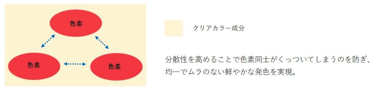 分散性を高めることで色素同士がくっついてしまうのを防ぎ、均一でムラのない鮮やかな発色を実現。