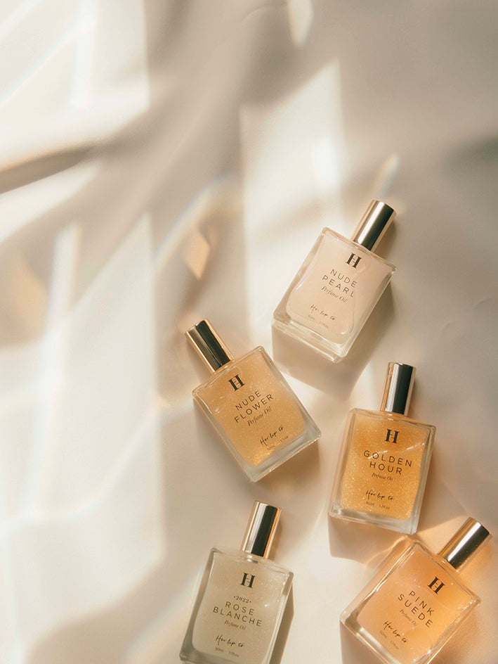 Her lip toの描く”LOVE・ GRACE ・CHARM”の象徴。日々の新たなチャプターを輝かせる優しい光に包まれたような香り。ピュアなホワイトローズペタルが軽やかに香るトップと、センティフォリアローズの華やかで芳醇な甘い香りに、エレガントな爽やかさと瑞々しい香気のラベンダーがまじり合うミドル。アガーウッドの奥深いスモーキーさとシストローズのアンバーグリスやムスクを思わせる甘さと薫香。時間が経つに連れ深く洗練されていく香調です。