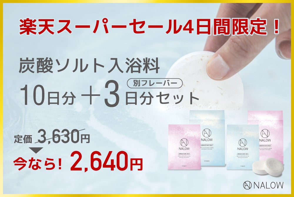 NALOW(ナロウ)楽天公式モールでは、炭酸ソルト入浴料<ジャスミンの香り>の発売を記念して、楽天スーパーセール期間中の4日間限定でお得なセールを実施中です。