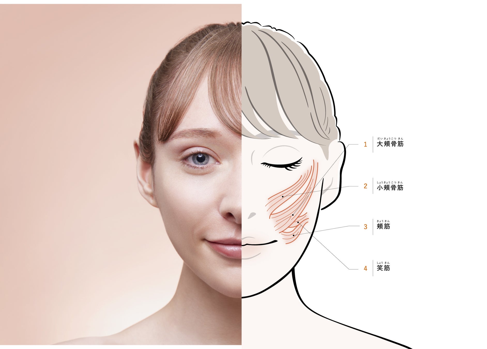 顔用に新たに独自開発したEMSが大頬骨筋、小頬骨筋、頬筋、笑筋といった4つの表情筋にアプローチし、表情筋を効率的にトレーニングします。