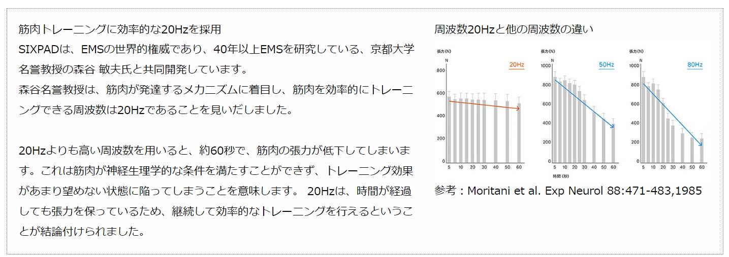 コアとなるEMS(Electrical Muscle Stimulation=筋電気刺激)は、安全性を第一に配慮し、適切な体感とトレーニング効果を両立した、独自テクノロジーの 「CMM Pulse (シーエムエムパルス)」を開発。唯一無二のCMM Pulseは、EMSを40年以上研究し、トレーニングに効率的な周波数20Hzを見出した、京都大学名誉教授 森谷 敏夫氏の理論、低い周波数特有の痛みを解決したMTGの独自波形、世界的トップアスリートのトレーニング理論を融合して誕生しました。SIXPADのコアテクノロジーとして、すべてのEMS商品に搭載しています。