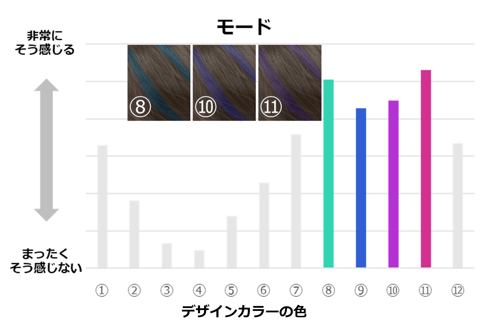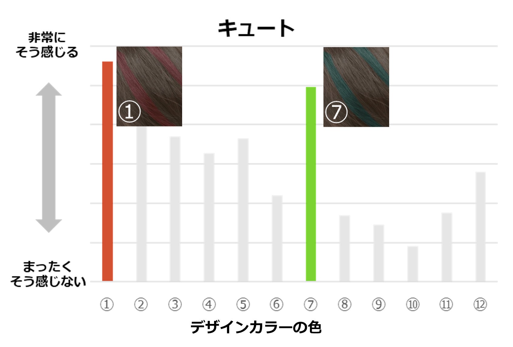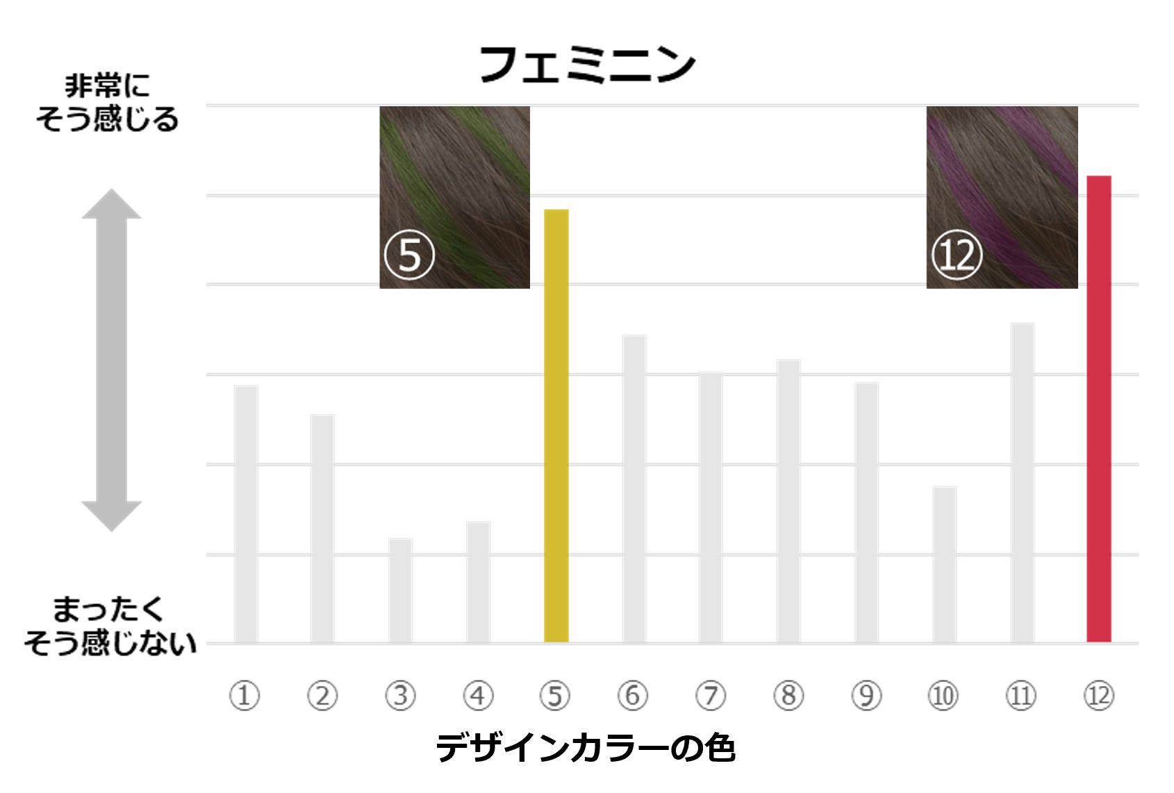 回答を分析した結果、最も多くの対象者が「フェミニン」に感じると回答したのは⑤黄色系と⑫ピンク系の場合で、「キュート」では①赤系と⑦緑系、「モード」では⑧~⑪の青系から赤紫系の4色、「ゴージャス」では⑪赤紫系の回答率が高い結果でした(図3)。以上のように、デザインカラーに使用する色によって印象が変わることが明らかとなりました。今回の発見を応用すると、髪の毛全体の色を変えなくとも、毎日のおしゃれにデザインカラーをプラスするだけで簡単に印象をチェンジすることができると考えられます。