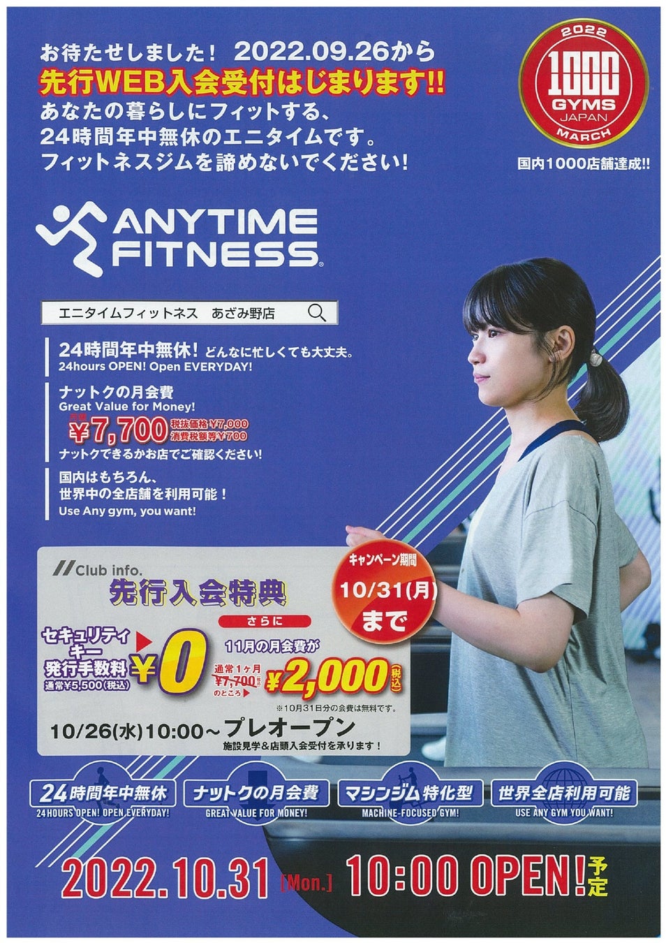 オープンに先駆けて、本日(2022年9月26日)より、エニタイムフィットネス『あざみ野店』の先行web入会受付が開始致しました。