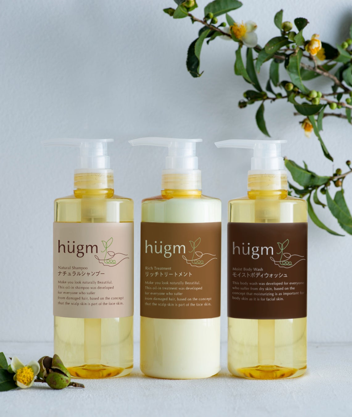 そんな想いをカタチにし、保湿成分やエモリエント成分として100%静岡県産の「茶の実オイル」※₁を配合しているのがhugm(ハグム)シリーズです。茶の実オイルは1㎏の茶の実からわずか100gほどしか抽出できず、一粒一粒手摘みした茶の実から丁寧に抽出されます。そんな希少なオイルを贅沢に配合したヘアケア・ボディケア商品を展開しています。