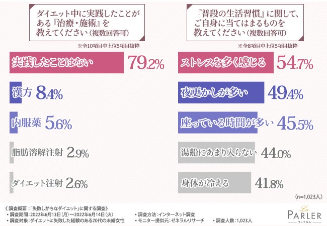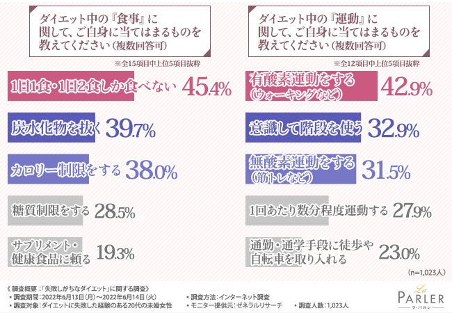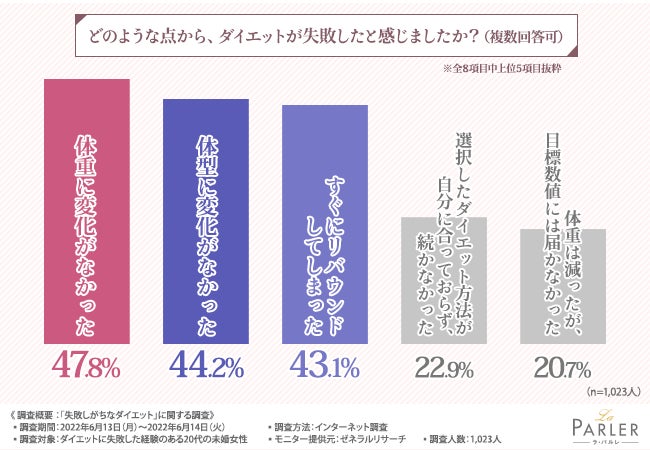 そこで今回、栗原クリニック東京・日本橋×La PARLER(ラ・パルレ)のコラボによる新メディカル提携エステを提供する株式会社ニューアート・ヘルス&ビューティー(https://www.parler.co.jp/)は、ダイエットに失敗した経験のある20代の未婚女性を対象に、「失敗しがちなダイエット」に関する調査を実施しました。
