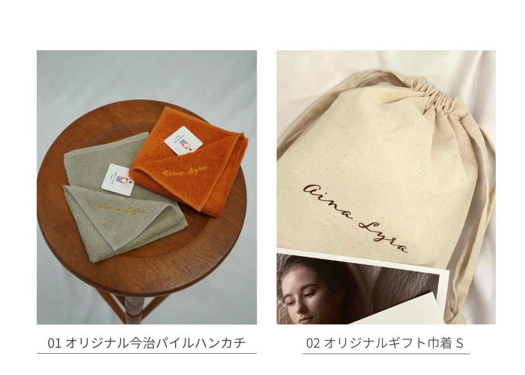 今治パイルハンカチは秋の訪れを感じる「オレンジ」とシンプルなデザインの「グレーベージュ」の2種類をご用意。巾着にはainaLyraで発売中のアイテムが1点すっぽり入る大きさなので、ハンカチとセットで大切な人へのギフトとしてもおすすめです。ぜひ、この機会にainaLyraの世界観をお楽しみください。