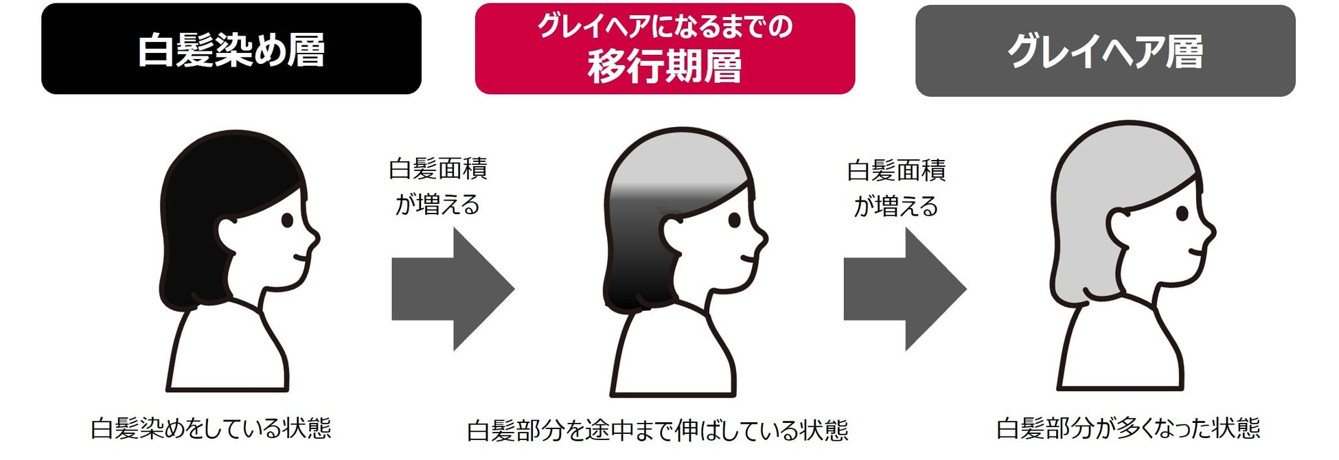 髪の毛が伸びる速度は、1ヵ月に約1cm、1年で約12cmと言われており、白髪染めをしている方がグレイヘアに完全に移行するまでには、1年以上かかります。今回は、現在白髪染めをしている「白髪染め層」と、グレイヘアに移行途中である「移行期層」、そして「グレイヘア層」のそれぞれの層を対象に「グレイヘア」に関する様々な調査を実施いたしました。