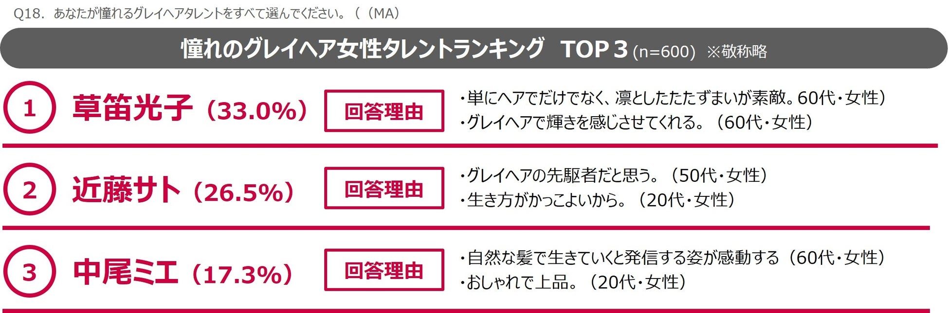 最後に、各世代が憧れる「グレイヘア女性タレント」のランキングを発表。第1位は、女優として活躍する「草笛光子さん(33.0%)」となりました(Q19)。回答者からは、「単にヘアでだけで憧れているのではなく、凛としたたたずまいが素敵。(60代・女性)」、「グレイヘアで輝きを感じさせてくれる(60代・女性)」などの理由が挙げられ、草笛さんの生き生きと自分らしく生きている姿に憧れを持つ女性が多いことが分かりました。次いで、第2位はグレイヘアのパイオニアとも言われる「近藤サトさん(26.5%)」、第3位は歌手・女優の「中尾ミエさん(17.3%)」が続く結果となりました。