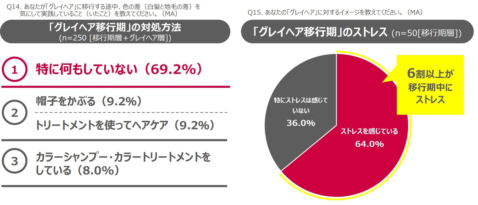 続いて、「グレイヘア移行期層」「グレイヘア層」の方に、白髪と白髪染めの髪色の差に対するケアを何か実践しているか(していたか)聞いたところ、約7割が「特に何もしていない(69.2%)」と回答(Q14)。しかし、現在グレイヘアに移行中の「グレイヘア移行層」の中で「何らかのストレスを感じる」と回答した人は全体で64.0%に上り(Q15)、感じるストレスとして「白髪と以前染めた部分との色の差がみっともない(20.0%)」、「伸びかけの白髪を隠すのが面倒くさい/伸びかけの白髪を上手くごまかせない(14.0%)」など髪色の変化に関する悩みが回答の上位に。髪色の差にストレスを感じていながらも、何も対処できていない人が多いことが判明しました。