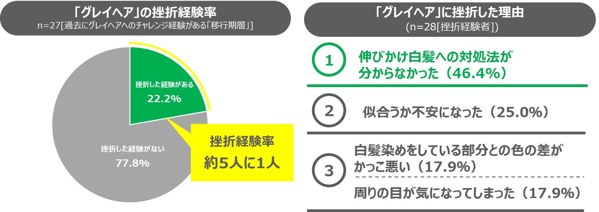 「グレイヘア」の挫折経験についても調査。 「白髪染め層」「グレイヘア移行期層」「グレイヘア層」の50~70代の女性にこれまで「グレイヘア」を断念・挫折してしまった経験について聞いてみると、「グレイヘア移行期層」の中で過去にも「グレイヘア」へのチャレンジ経験がある27名は、22.2%が過去に挫折経験があることが分かりました。また「グレイヘア挫折経験者」28名にその理由を聞いてみると、約半数が「伸びかけ白髪への対処法が分からなかった(46.4%)」と回答したことが明らかに。その他、「伸びかけの白髪を隠すのが面倒くさい/伸びかけの白髪を上手くごまかせない(14.0%)」等の意見も上位に上がり、「グレイヘアにしたい」という意思があったとしても、白髪の伸ばし方や白髪と以前染めた部分の色の差のケア方法を知らないことから挫折してしまうケースが多いことが分かりました。