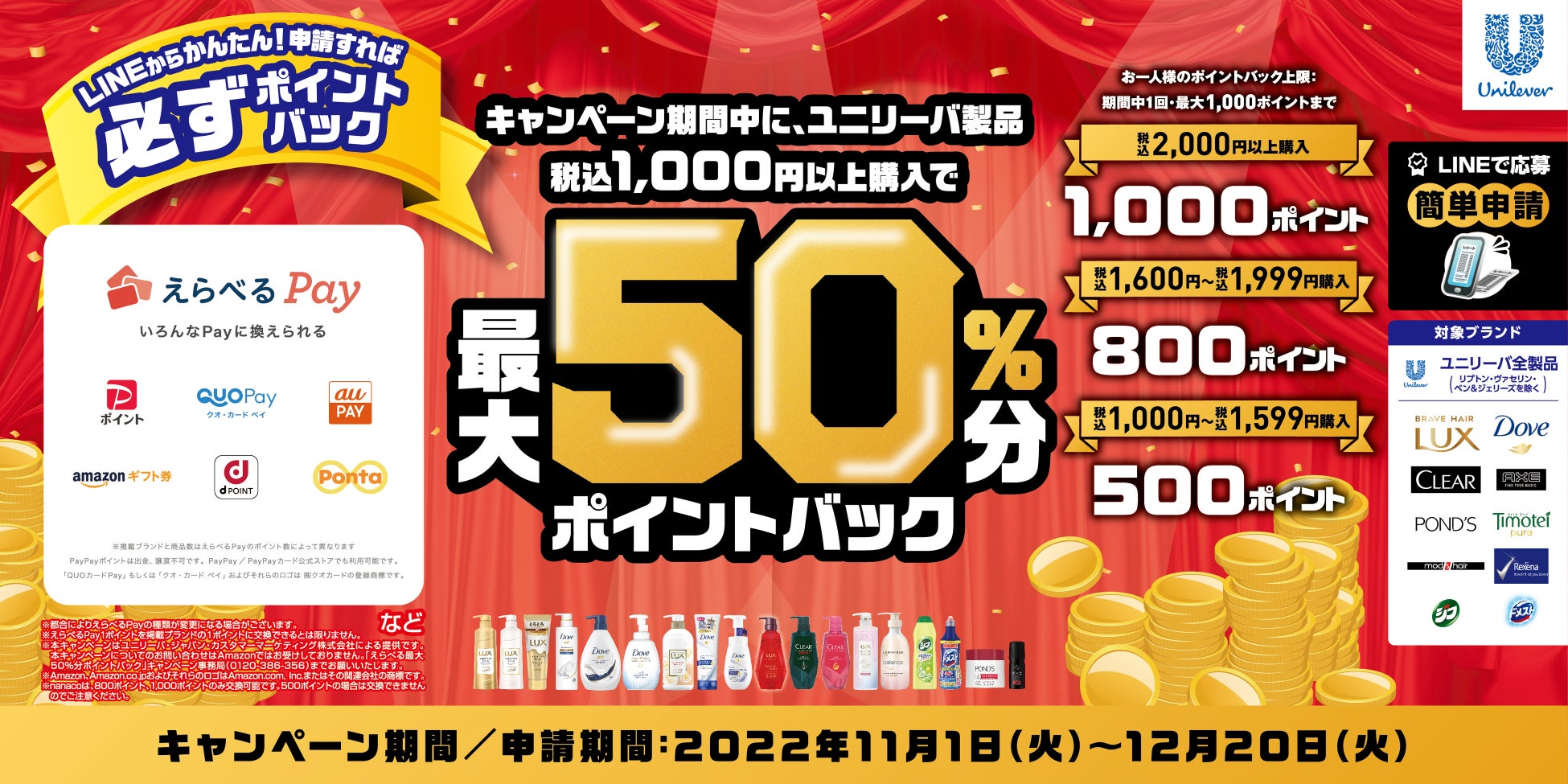 ユニリーバ・ジャパン・カスタマーマーケティング株式会社(本社:東京都目黒区、代表取締役 社長:ジョイ・ホー)は、2022年11月1日(火)より、キャンペーン期間中にユニリーバの対象製品を1,000円(税込)以上ご購入の上、LINEから応募してくださった方に、購入金額の最大50%分をポイントバックするキャンペーンを開催いたします。ポイントは、PayPayポイントやdポイント、au PAY ギフトカードなどの「えらべるPay」からお好きなポイントをえらんで受け取れます。