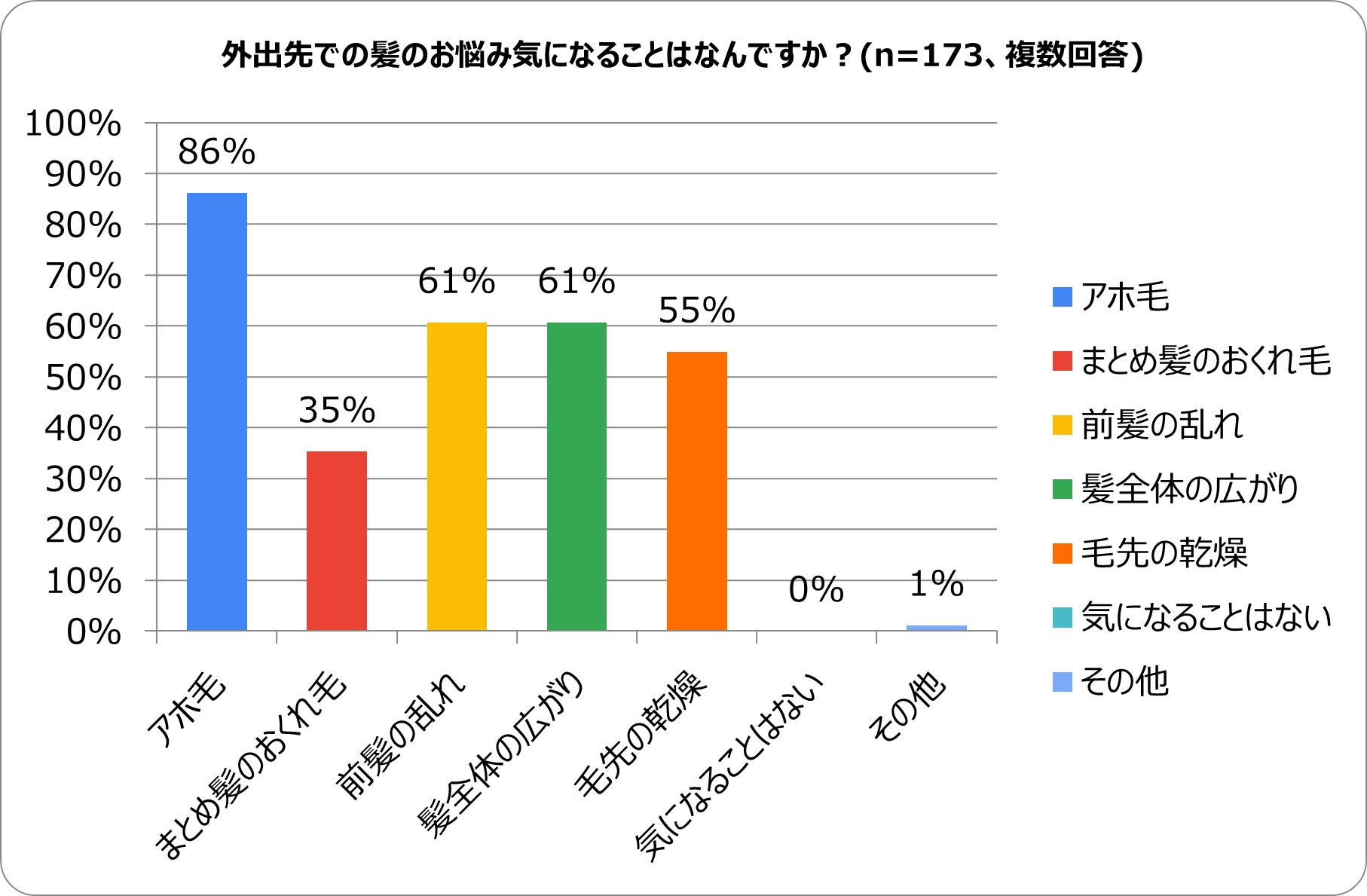 - 外出先で気になる髪のお悩みは、1位が「アホ毛」、同率2位で「前髪の乱れ」、「髪全体の広がり」