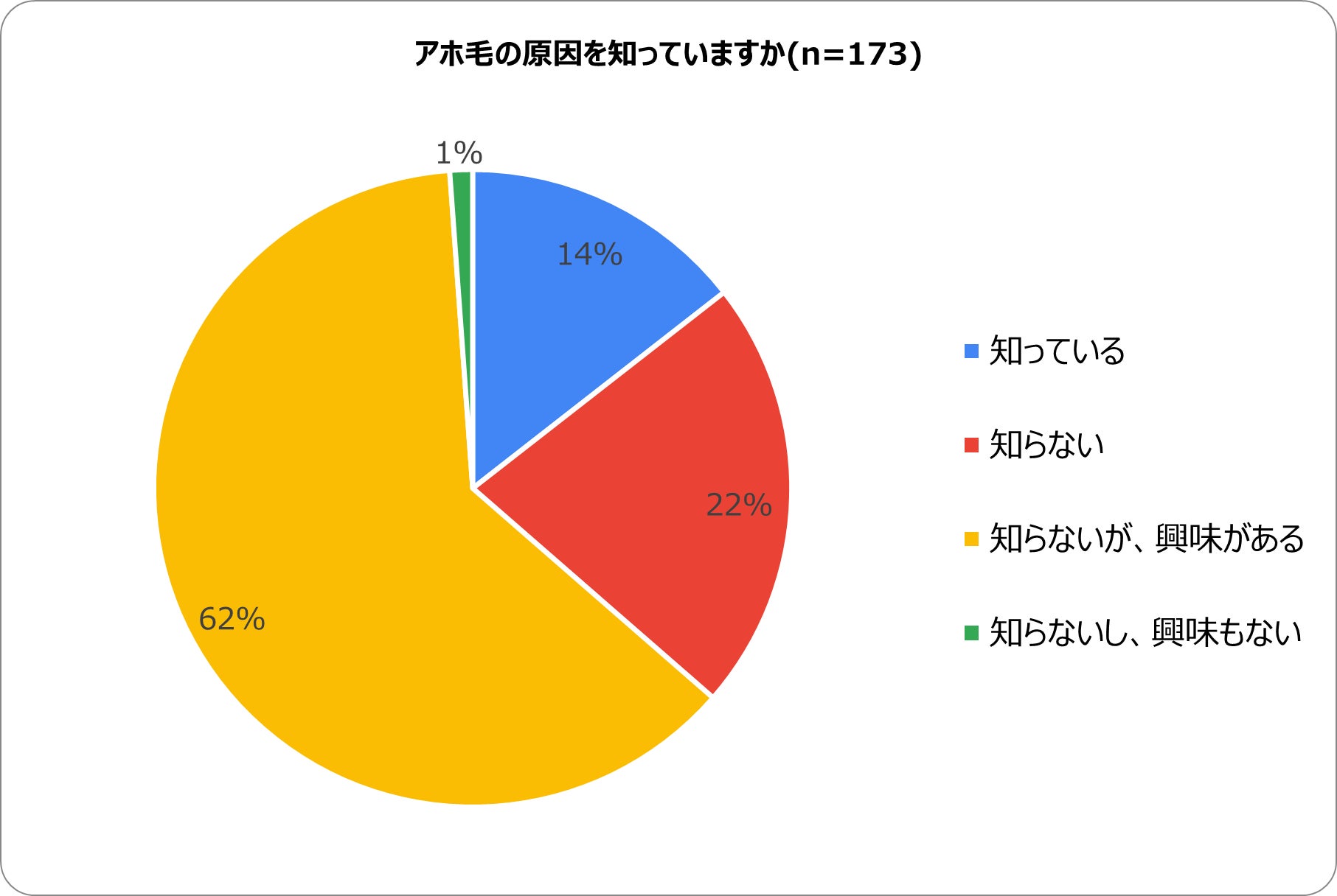 また、「アホ毛の原因を知っていますか」という質問では、「知らない」という人の割合が約85%にのぼりました。その中で原因を知りたいと思っている人は62%と半数を超える結果となり、アホ毛について、一番の悩みでありつつも原因がわからず、どうしたらよいか迷っている人が多いという結果となりました。
