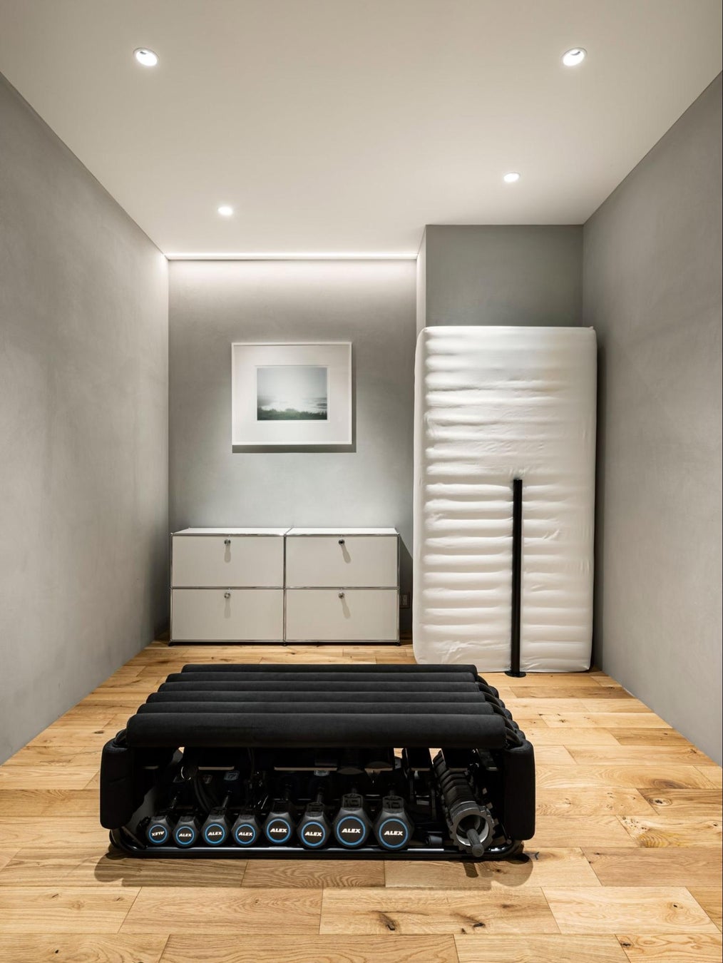 Minimal gymにはストレッチや筋膜リリースなど体をほぐせるアイテムも充実。収納フレームは簡易ベッドにもなり、トレーナーの施術台としても活用可能です。デスクワークで固まりがちなカラダを健康に保つには、ケアをこまめに取り入れることが大切。仕事終わりや休憩時間に、ほんの少しストレッチの時間を取り入れるだけで、肩こりや姿勢の改善につながります。