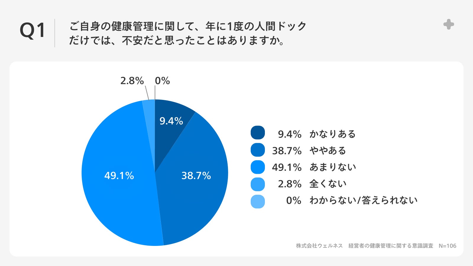 「Q1.ご自身の健康管理に関して、年に1度の人間ドックだけでは、不安だと思ったことはありますか。」(n=106)と質問したところ、「かなりある」が9.4%、「ややある」が38.7%という回答となりました。