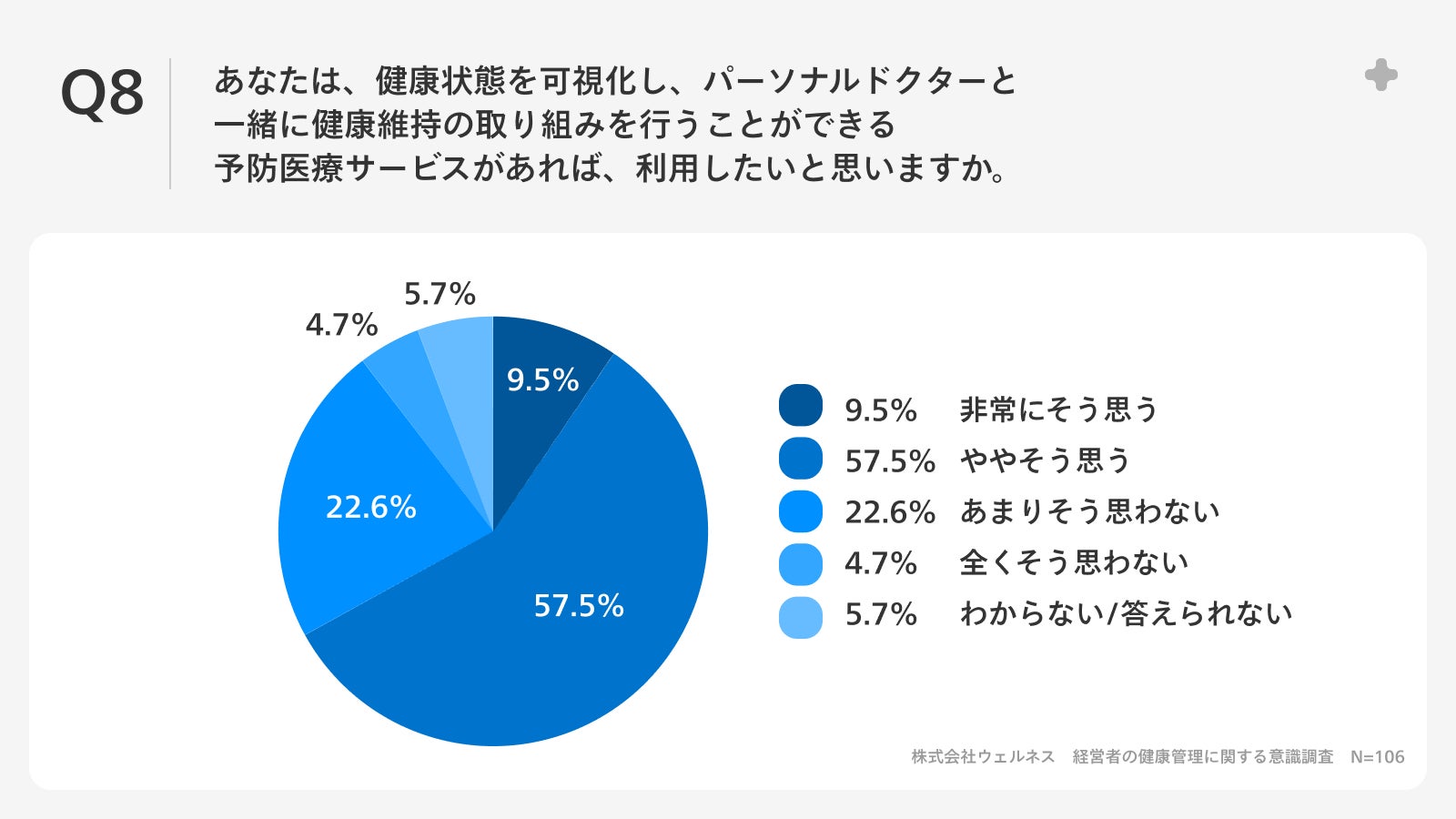 「Q8.あなたは、健康状態を可視化し、パーソナルドクターと一緒に健康維持の取り組みを行うことができる予防医療サービスがあれば、利用したいと思いますか。」(n=106)と質問したところ、「非常にそう思う」が9.5%、「ややそう思う」が57.5%という回答となりました。
