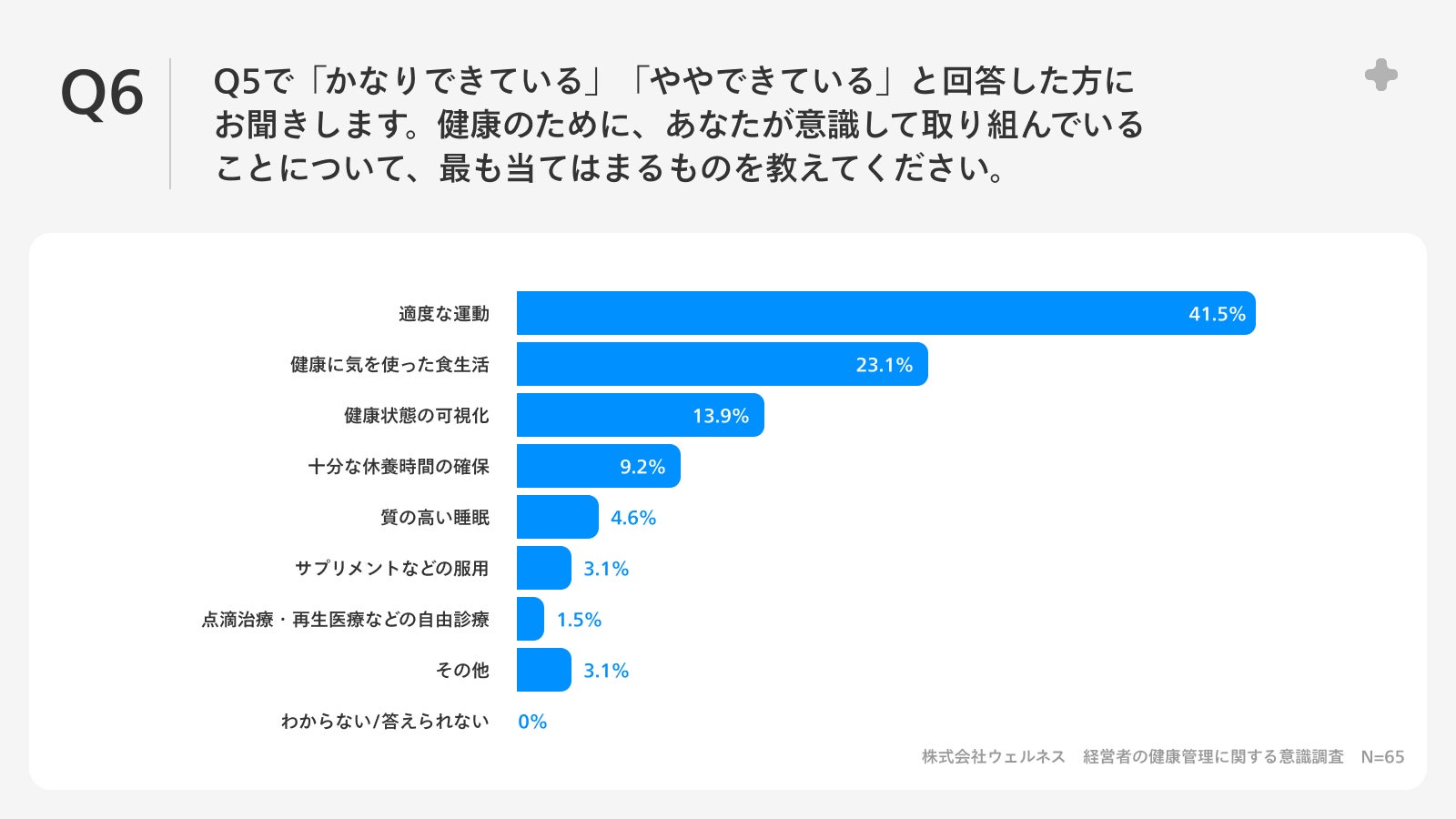 Q5で「かなりできている」「ややできている」と回答した方に、「Q6.健康のために、あなたが意識して取り組んでいることについて、最も当てはまるものを教えてください。」(n=65)と質問したところ、「適度な運動」が41.5%、「健康に気を使った食生活」が23.1%、「健康状態の可視化」が13.9%という回答となりました。