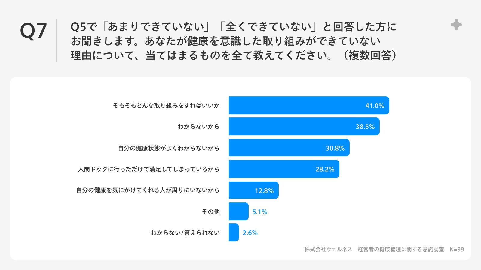 Q5で「あまりできていない」「全くできていない」と回答した方に、「Q7.あなたが健康を意識した取り組みができていない理由について、当てはまるものを全て教えてください。(複数回答)」(n=39)と質問したところ、「そもそもどんな取り組みをすればいいかわからないから」が41.0%、「健康管理に時間を割けないから」が38.5%、「自分の健康状態がよくわからないから」が30.8%という回答となりました。