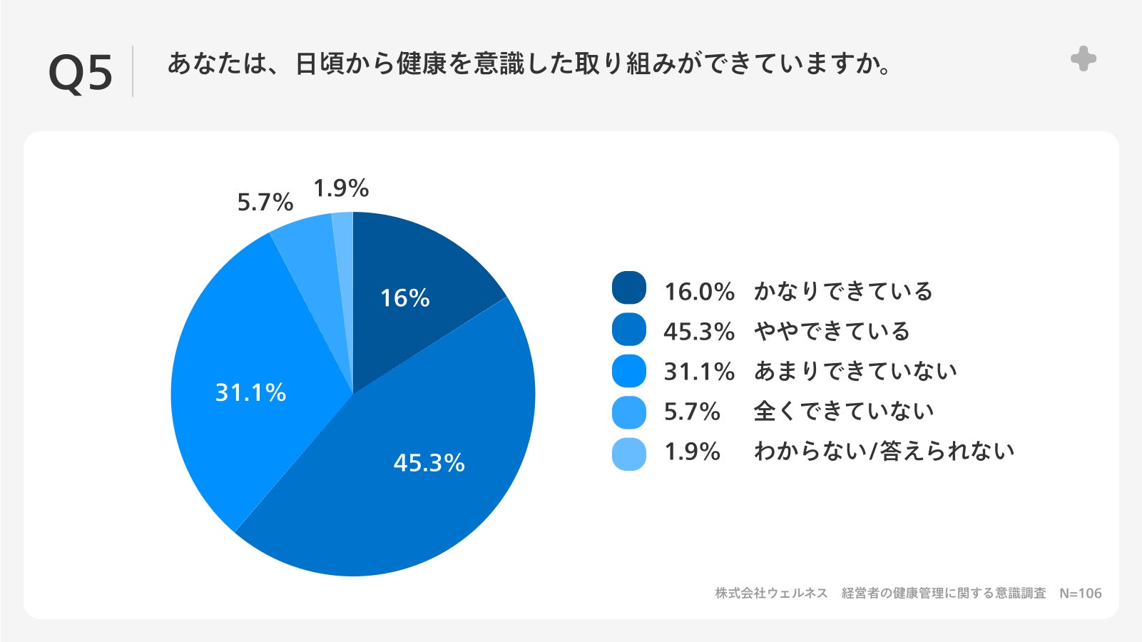 「Q5.あなたは、日頃から健康を意識した取り組みができていますか。」(n=106)と質問したところ、「かなりできている」が16.0%、「ややできている」が45.3%という回答となりました。