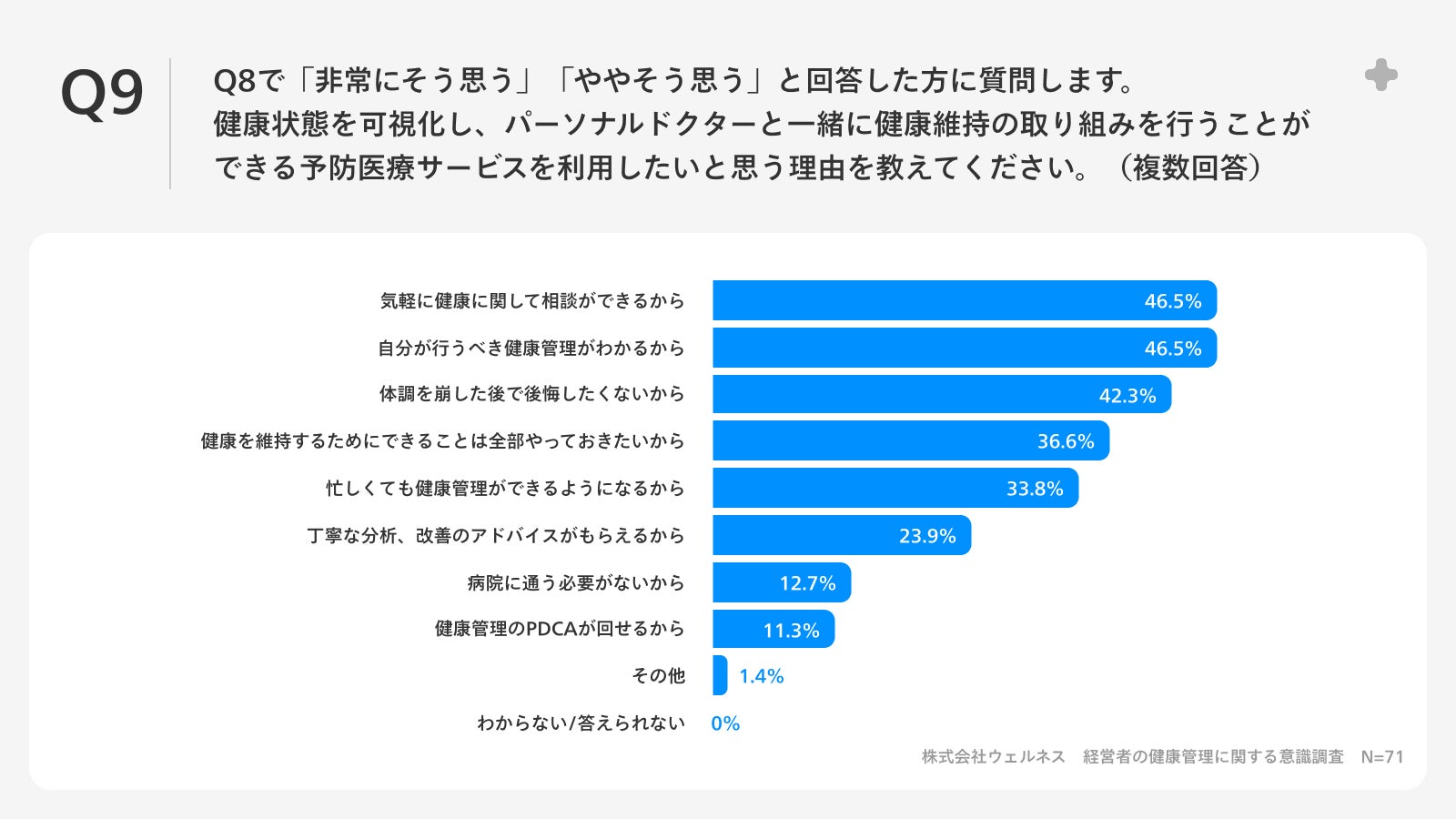 Q8で「非常にそう思う」「ややそう思う」と回答した方に、「Q9.健康状態を可視化し、パーソナルドクターと一緒に健康維持の取り組みを行うことができる予防医療サービスを利用したいと思う理由を教えてください。(複数回答)」(n=71)と質問したところ、「気軽に健康に関して相談ができるから」が46.5%、「自分が行うべき健康管理がわかるから」が46.5%、「体調を崩した後で後悔したくないから」が42.3%という回答となりました。