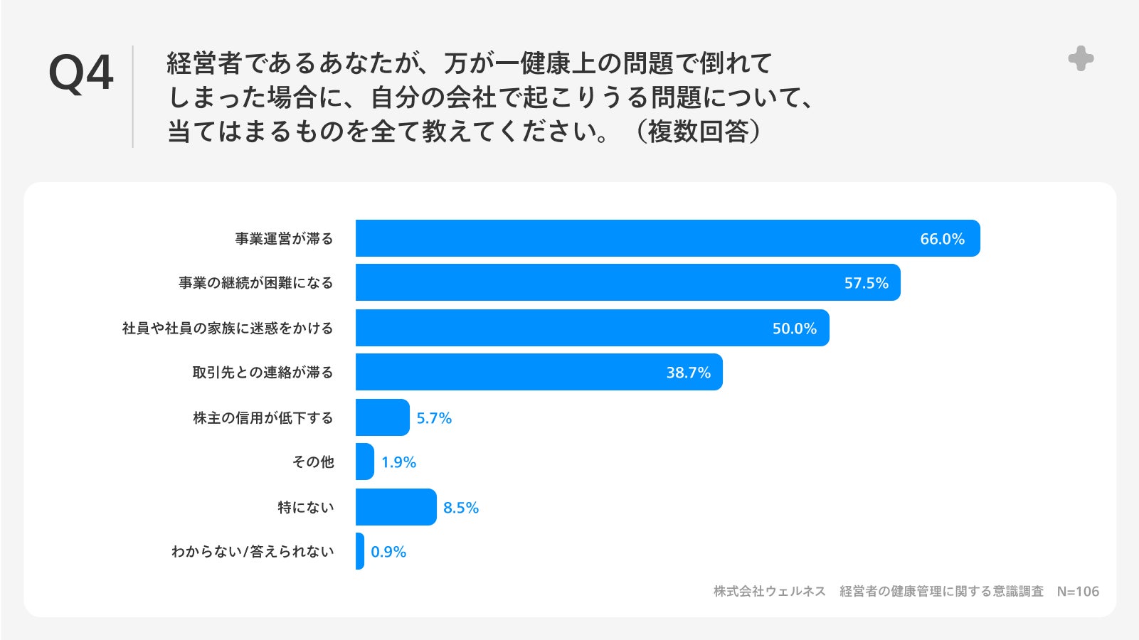 「Q4.経営者であるあなたが、万が一健康上の問題で倒れてしまった場合に、自分の会社で起こりうる問題について、当てはまるものを全て教えてください。(複数回答)」(n=106)と質問したところ、「事業運営が滞る」が66.0%、「事業の継続が困難になる」が57.5%、「社員や社員の家族に迷惑をかける」が50.0%という回答となりました。