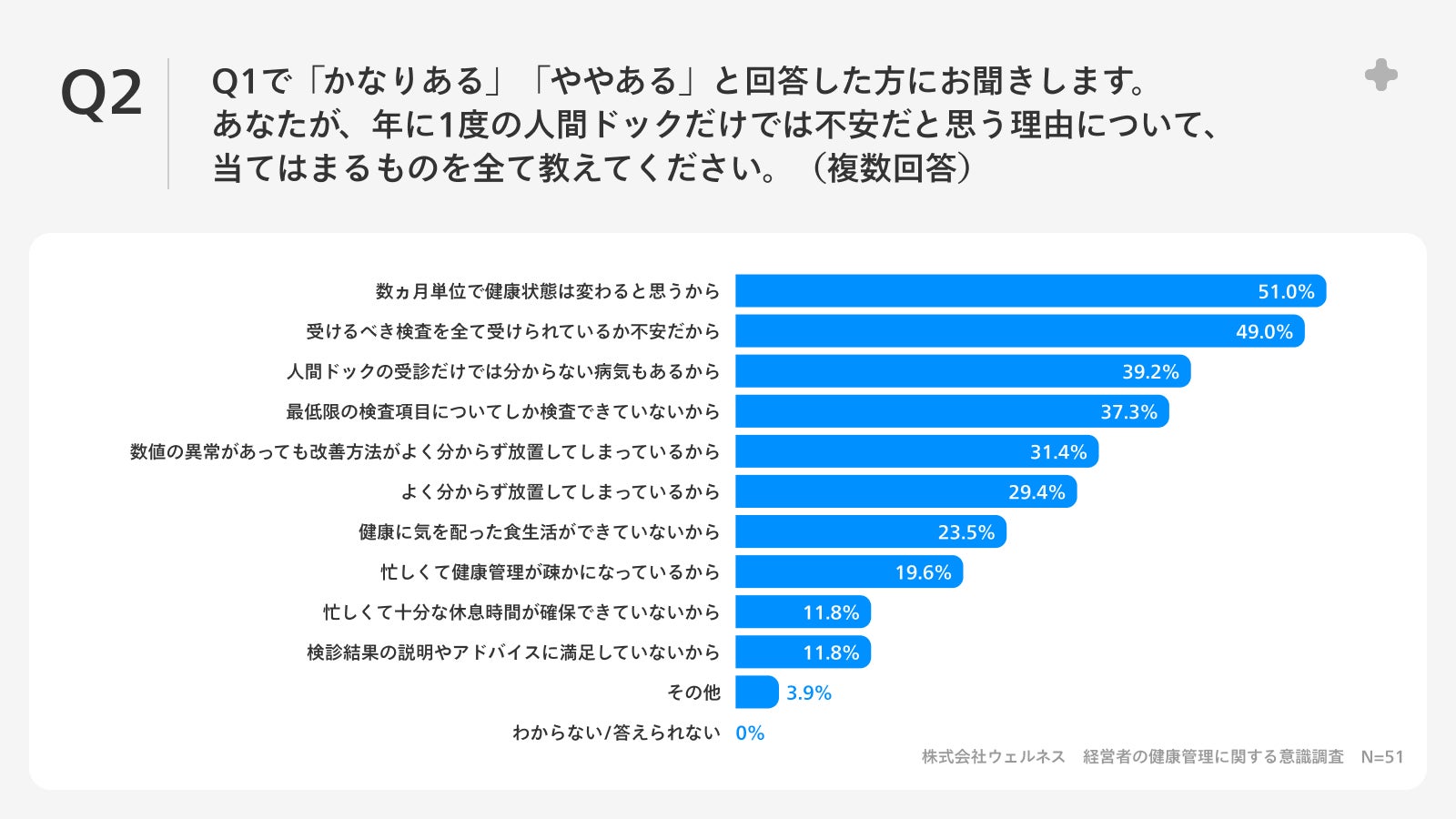 Q1で「かなりある」「ややある」と回答した方に、「Q2.あなたが、年に1度の人間ドックだけでは不安だと思う理由について、当てはまるものを全て教えてください。(複数回答)」(n=51)と質問したところ、「数ヵ月単位で健康状態は変わると思うから」が51.0%、「受けるべき検査を全て受けられているか不安だから」が49.0%、「人間ドックの受診だけでは分からない病気もあるから」が39.2%という回答となりました。