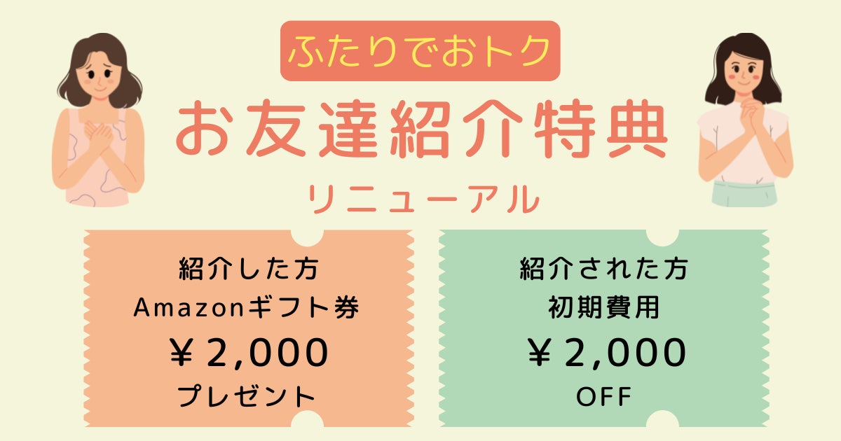 現在LUNA STUDIO/LUNA DANCEに通ってくださっている会員様がお友達を紹介してくださると、会員様にはAmazonギフト券2,000円分をプレゼント、紹介された新規会員様は紹介特典として、初期費用が2,000円OFFになるというものです。