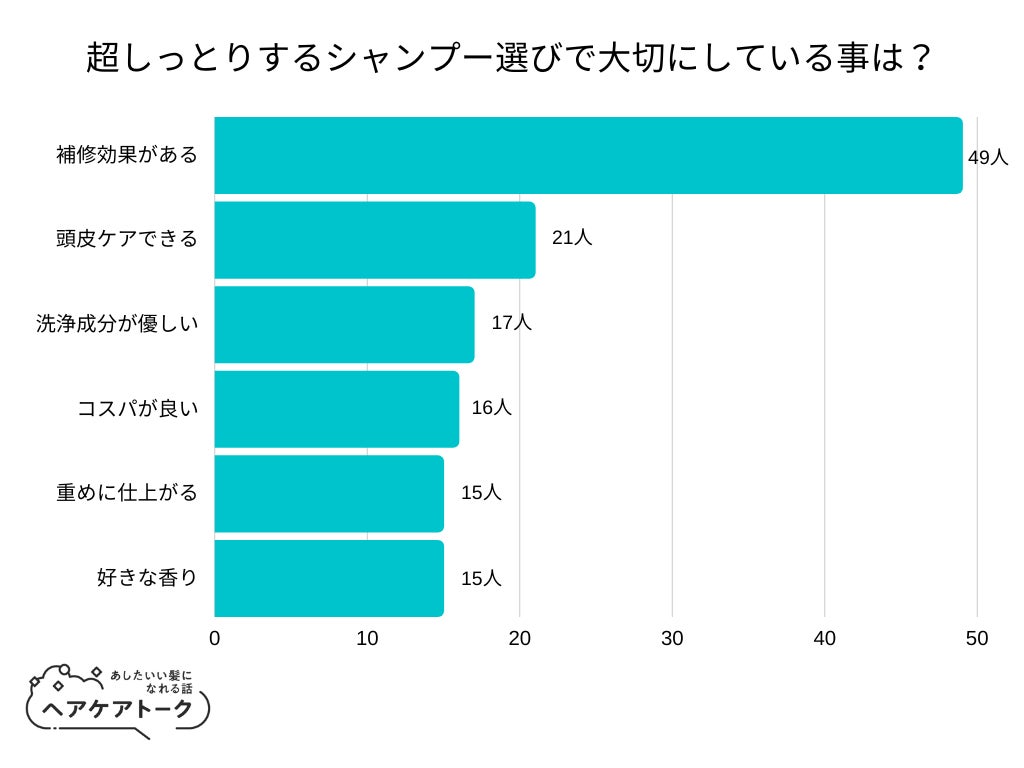 「超しっとりするシャンプー選びで大切にしている事は?」とアンケート調査した結果、1位は『補修効果がある』でした。