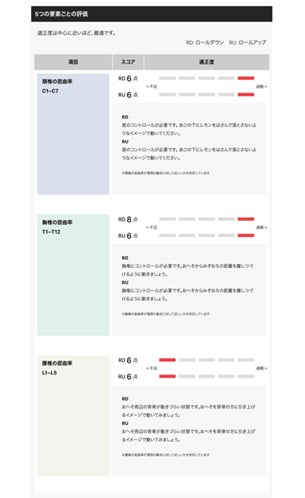 ※「頸椎/胸椎/腰椎の屈曲率」の3項目は、屈曲率が理想の動きに対して近しいかを判定。