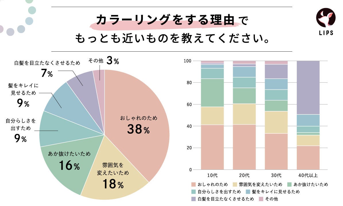 特に「髪をキレイに見せたい」という回答は、20代以降の年代に多く、「あか抜けたい」という回答は10代に多く見られました。
