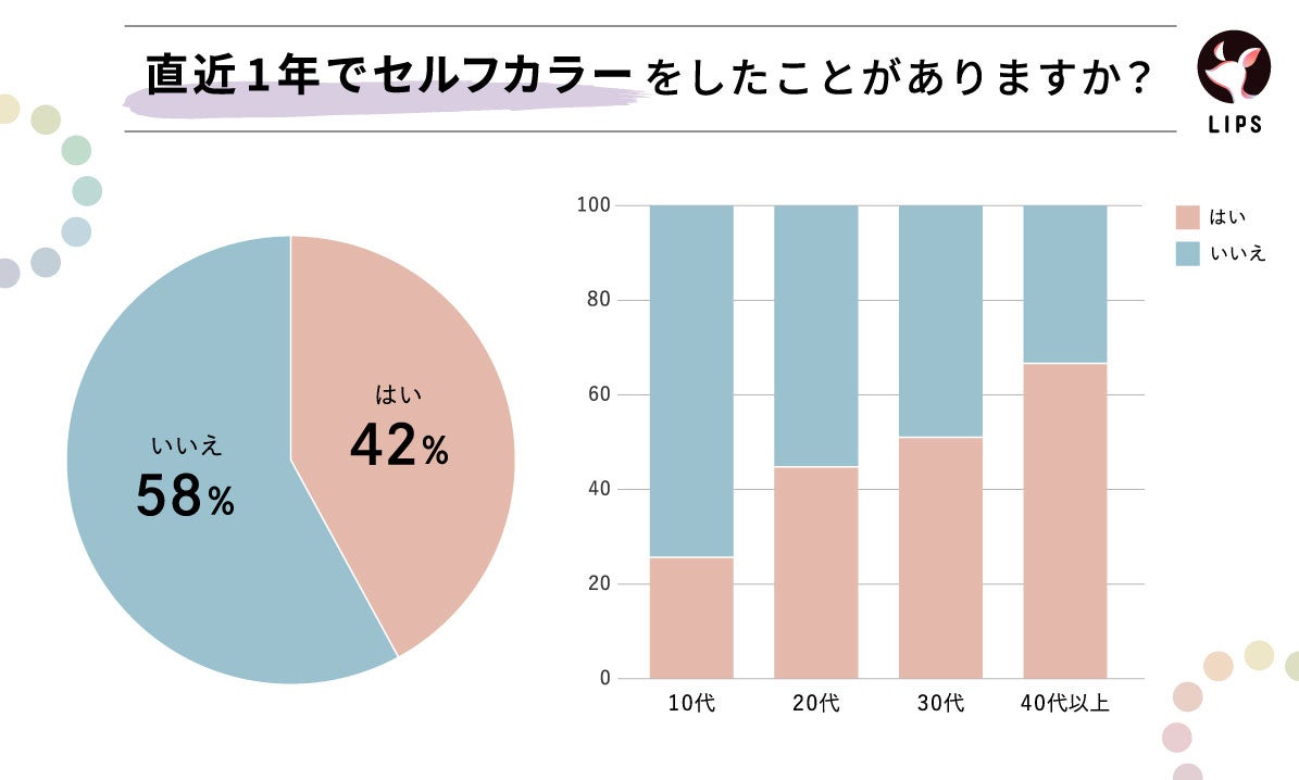 また「直近1年でセルフカラーをしたことがありますか?」という質問に対しては、全体の約4割が「セルフカラーをした」という結果に。こちらも年代が上がるにつれて多くなる傾向になり、40代以上では約7割近くが「セルフカラーをした」と回答しました。