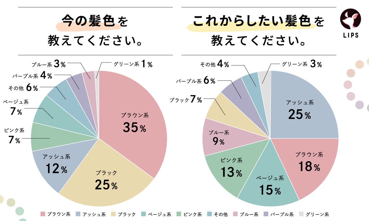 また、今の髪色と、これからどんなカラーに挑戦したいかを調査。現状は、ブラウン(35%)、次いでブラック(25%)が多いという結果になりました。