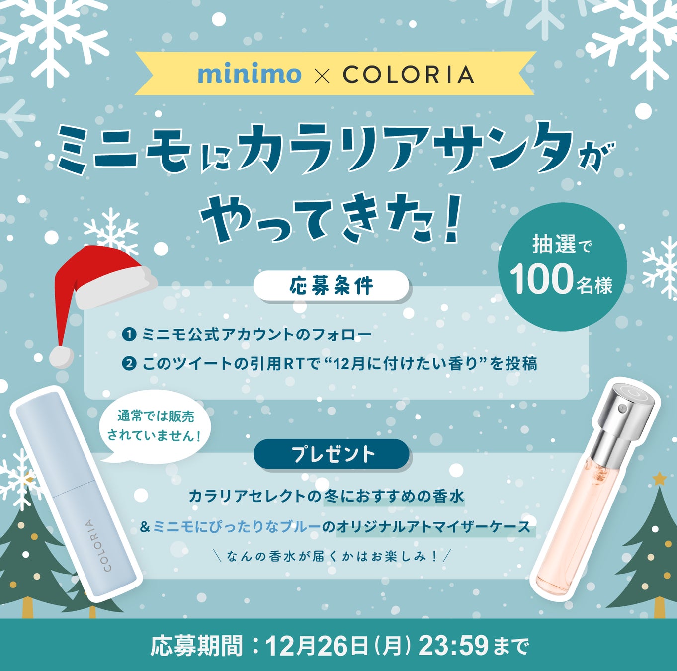 さらに、ミニモやカラリアの公式Twitterから投稿されるキャンペーン対象ツイートを引用リツイートすると抽選で「カラリアがセレクトした香水アトマイザーとミニモをイメージした限定色アトマイザーケースのセット」や「Panasonic ヘアードライヤー ナノケア EH-NA0J」が当たるTwitterキャンペーンも同時開催します。