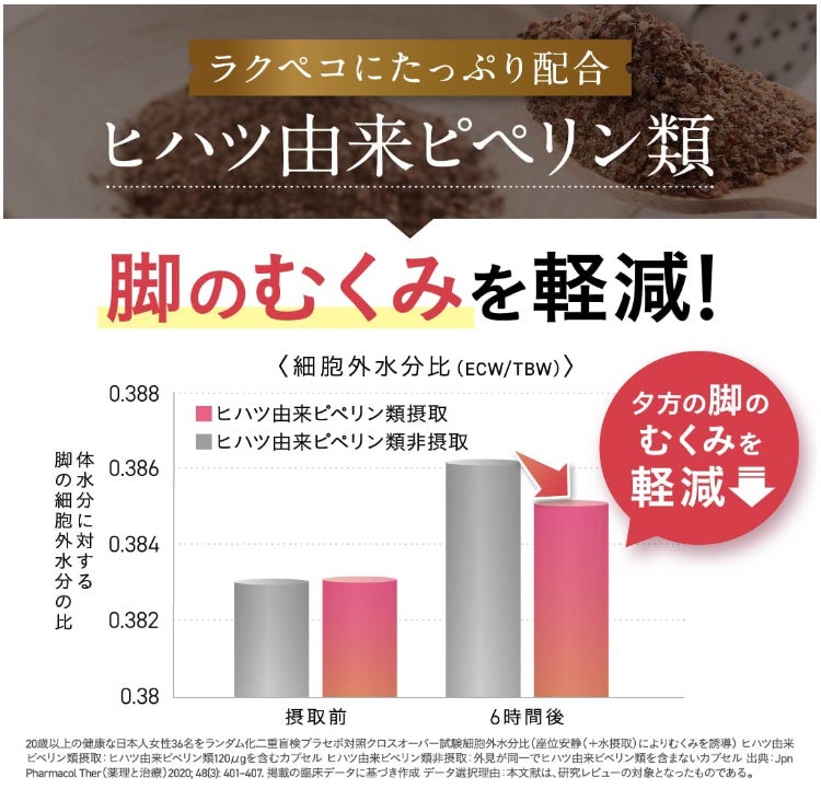 ヒハツ由来ピペリン類には、脚のむくみが気になる健常な女性の夕方の脚のむくみを軽減