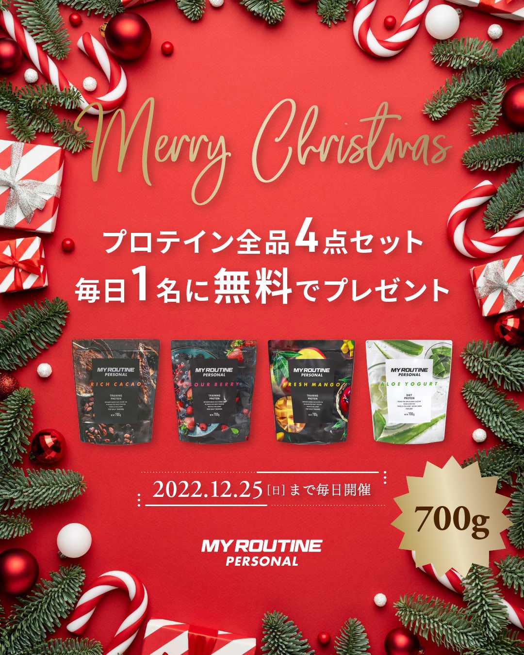 プロテインやスポーツサプリメントなど革新的な商品を展開し、健康食品部門を強化している株式会社ウエニ貿易(本社:東京都台東区、代表取締役社長:宮上光喜)が販売しているプロテインブランド「マイルーティーンパーソナル」で、初のクリスマス限定企画、プレゼントキャンペーを公式Instagramアカウントにて12/16(金)~12/25(日)で実施します。