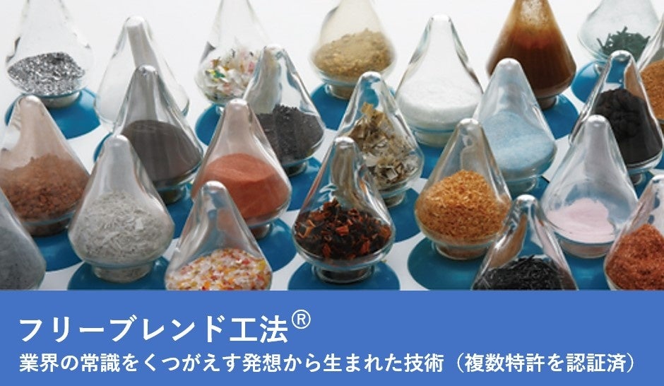 フリーブレンド工法はプラスチック原料をベースに、目的材と呼ばれる第二の素材を配合した新たな素材を作ると同時に製品を製造する特許技術です。プラスチック原料と他の素材を配合する技術はこれまでにもありましたが、フリーブレンド工法では原料同志をパウダー状で配合することにより配合する素材の選択肢が格段に広がると共に、高い配合率が可能となります。これによりプラスチック素材に新しい性能や高い機能を持たすことができ、これまであきらめていた機能や特性を持つ容器やコスメアイテムを製造することが可能となります。